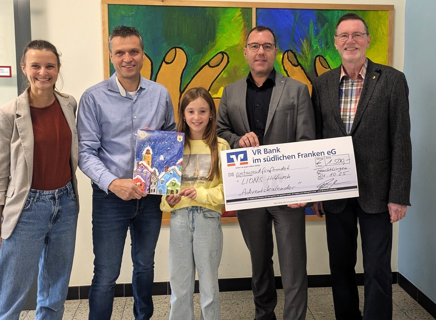 Stolz präsentiert die Viertklässlerin Sarah Bogic den von ihr gestalteten aktuellen Adventskalender des Lions Clubs Altmühltal. Dass jetzt 1000 Stück davon für einen guten Zweck verkauft werden können, ist auch dem Hauptsponsor - der VR Bank im südlichen Franken - zu verdanken: Michael Uhlig, stellvertretender Geschäftsstellenleiter in Treuchtlingen übergab dazu einen Scheck an Lions-Präsident Klaus Ziegler (rechts) | W. Hartl