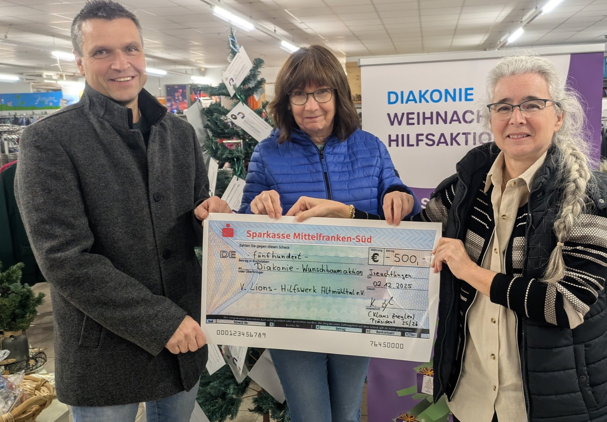 Lions- Präsident Klaus Ziegler übergab einen Scheck in Höhe von 500 Euro an Maria Schmoll, Leiterin des Sozialkaufhauses in Treuchtlingen und an Ulla Langer von der Sozialberatungsstelle der Diakonie in Weißenburg. Diese freuten sich über diese Unterstützung, hat die Zahl der Menschen, die auf Hilfe der Diakonie angewiesen ist, auch in diesem Jahr deutlich zugenommen. Mit der Aktion Wunschbaum kann bedürftigen Menschen eine kleine zusätzliche Freude zu Weihnachten bereitet werden. Sie können sich einen Wunsch erfüllen. Der Betrag wird über das Hilfswerk Altmühltal e.V. des Lions Clubs Altmühltal gespendet.